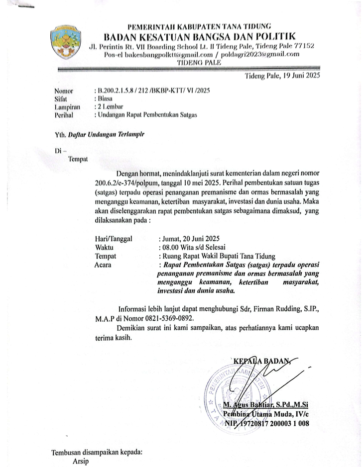 Undangan Rapat Pembentukan Satgas terpadu operasi penganganan premanisme dan ormas bermasalah yang menggangu keamanan, ketertiban masyarakat, investasi dan dunia . . .