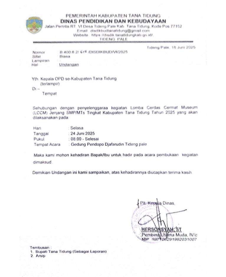 Undangan menghadiri Kegiatan Lomba Cerdas Cermat Museum (LCCM) Jenjang SMP/Mts Tingkat Kab. Tana Tidung Tahun . . .