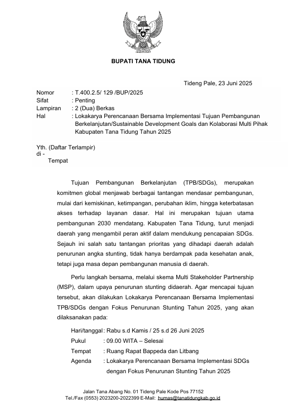 Lokakarya Perencanaan Bersama Implementasi Tujuan Pembangunan Berkelanjutan/Sustainable Development Goals dan Kolaborasi Multi Pihak Kabupaten Tana Tidung Tahun 2025 . Lokakarya Perencanaan Bersama Implementasi TPB/SDGs dengan Fokus Penurunan Stunting Tahun . . .