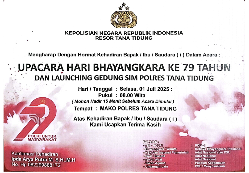 Undangan menghadiri Upacara Hari Bhayangkara ke 79 tahun dan Launching Gedung SIM POLRES Tana . . .