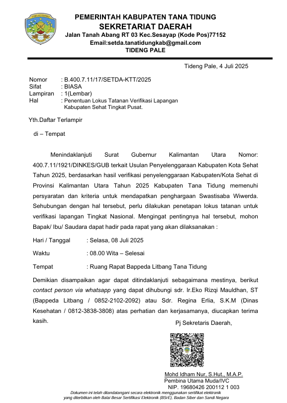 Undangan menghadiri Rapat Penentuan Lokus Tatanan Verifikasi Lapangan Kabupaten Sehat Tingkat . . .