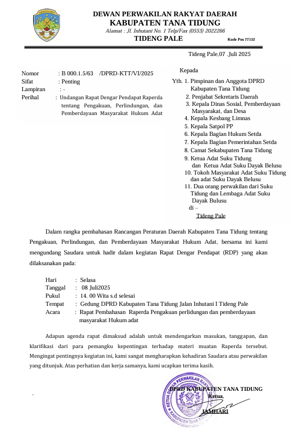 Undangan Rapat Dengar Pendapat Raperda tentang Pengakuan, Perlindungan, dan Pemberdayaan Masyarakat Hukum . . .