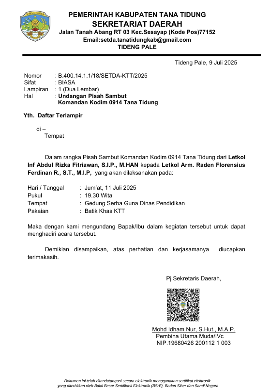 Undangan Dalam rangka Pisah Sambut Komandan Kodim 0914 Tana Tidung dari Letkol Inf Abdul Rizka Fitriawan, S.I.P., M.HAN kepada Letkol Arm. Raden Florensius Ferdinan R., S.T., . . .