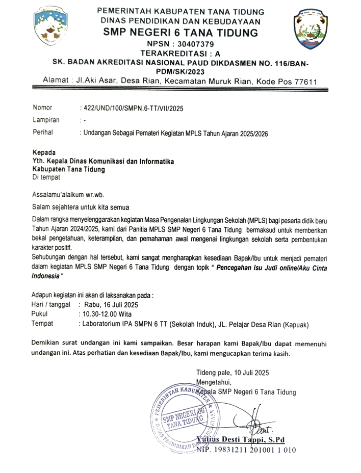 Undangan Sebagai Pemateri Kegiatan MPLS Tahun Ajaran 2025/2026 dengan Topik Pencegahan Isu Judi Online/ Aku Cinta . . .