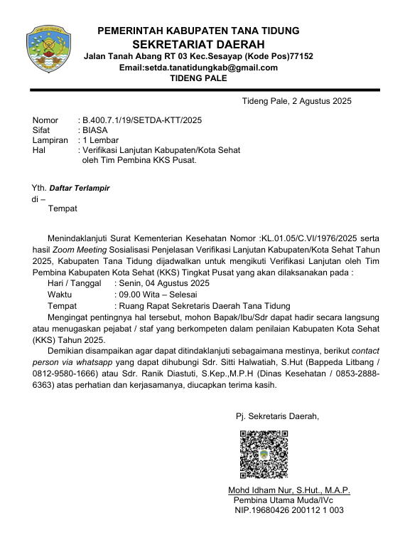 Undangan menghadiri Verifikasi Lanjutan Kabupaten/Kota Sehat oleh Tim Pembina KKS . . .